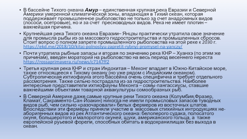 Крупнейшая река Тихого океана Евразии– Янцзы практически утратила свое значение для промысла рыбы из-за массового гидростроительства и промышленных сбросов. Стоит вопрос о полном запрете промышленного рыболовства на этой реке к 2030 г. https://ekd.me/2018/10/kitaj-polnostyu-zapretit-rybnyj-promysel-na-yanczy/