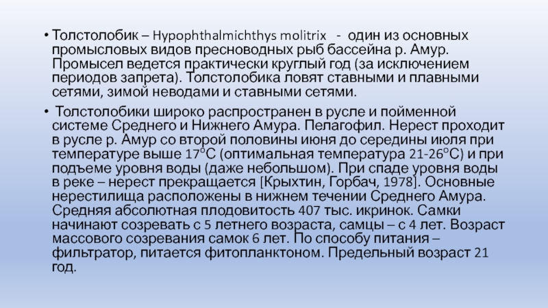 Толстолобики широко распространен в русле и пойменной системе Среднего и Нижнего Амура. Пелагофил. Нерест проходит в русле р. Амур со второй половины июня до середины июля при температуре выше 17оС (оптимальная температура 21-26оС) и при подъеме уровня воды (даже небольшом). При спаде уровня воды в реке – нерест прекращается [Крыхтин, Горбач, 1978]. Основные нерестилища расположены в нижнем течении Среднего Амура. Средняя абсолютная плодовитость 407 тыс. икринок. Самки начинают созревать с 5 летнего возраста, самцы – с 4 лет. Возраст массового созревания самок 6 лет. По способу питания – фильтратор, питается фитопланктоном. Предельный возраст 21 год.