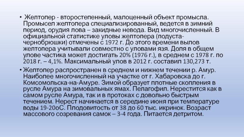 Слайд 80 Желтопер - второстепенный, малоценный объект промысла. Промысел желтопера специализированный,