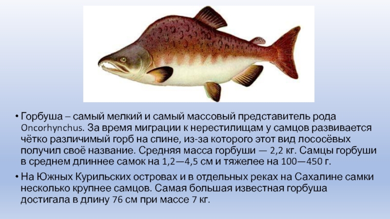 Слайд 9Горбуша – самый мелкий и самый массовый представитель рода Oncorhynchus.