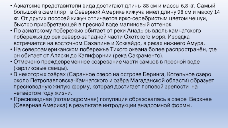длину 98 см и массу 14 кг. От других лососей кижуч отличается ярко-серебристым цветом чешуи, быстро приобретающей в пресной воде малиновый оттенок.