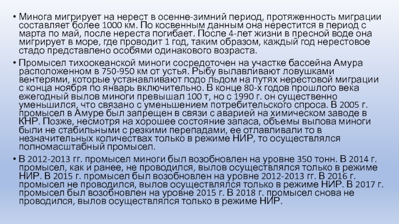 Слайд 95Минога мигрирует на нерест в осенне-зимний период, протяженность миграции составляет