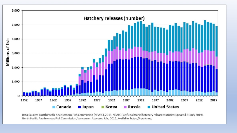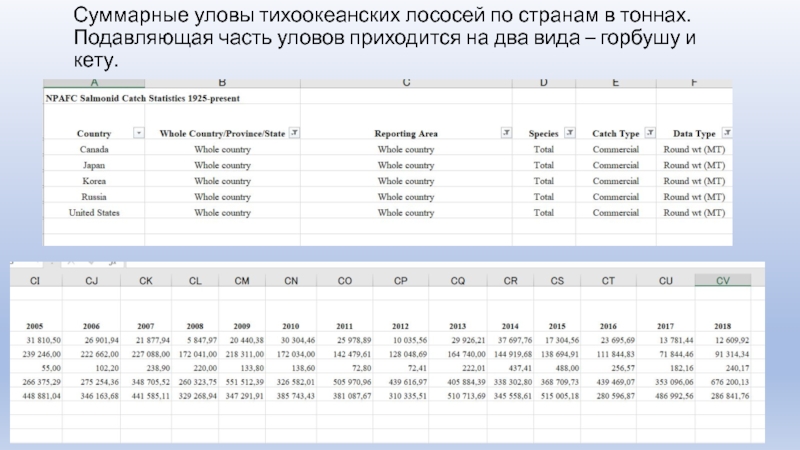 Слайд 7Суммарные уловы тихоокеанских лососей по странам в тоннах. Подавляющая часть