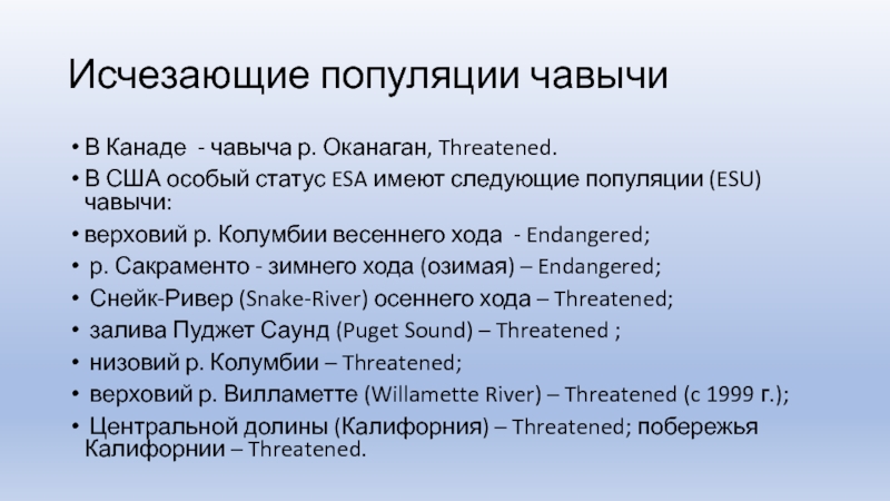 США особый статус ESA имеют следующие популяции (ESU) чавычи: