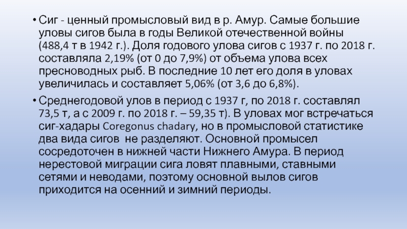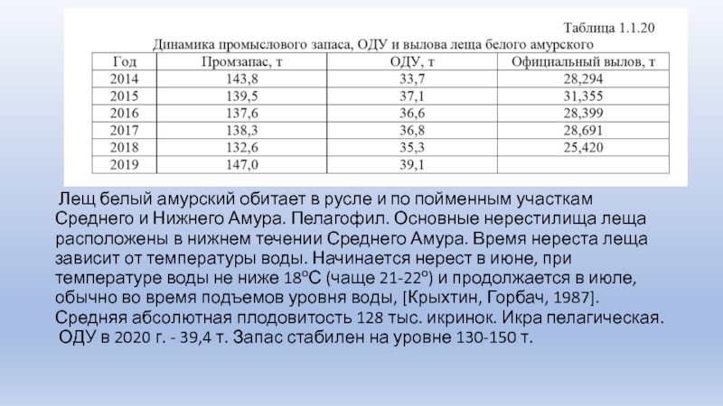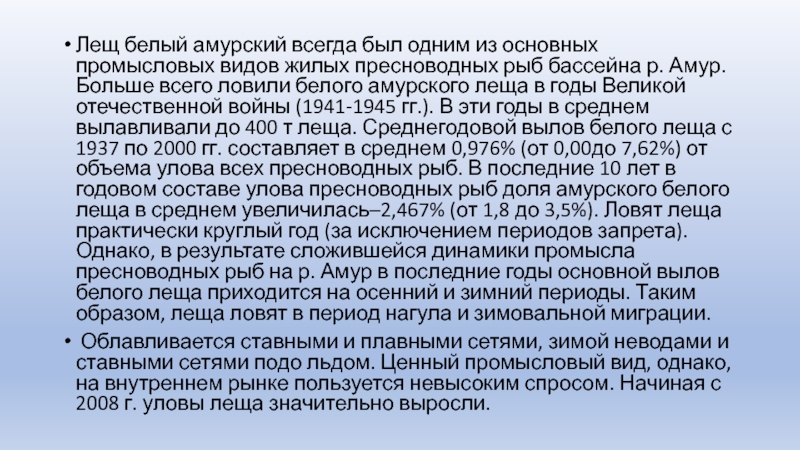 амурского леща в годы Великой отечественной войны (1941-1945 гг.). В эти годы в среднем вылавливали до 400 т леща. Среднегодовой вылов белого леща с 1937 по 2000 гг. составляет в среднем 0,976% (от 0,00до 7,62%) от объема улова всех пресноводных рыб. В последние 10 лет в годовом составе улова пресноводных рыб доля амурского белого леща в среднем увеличилась–2,467% (от 1,8 до 3,5%). Ловят леща практически круглый год (за исключением периодов запрета). Однако, в результате сложившейся динамики промысла пресноводных рыб на р. Амур в последние годы основной вылов белого леща приходится на осенний и зимний периоды. Таким образом, леща ловят в период нагула и зимовальной миграции.