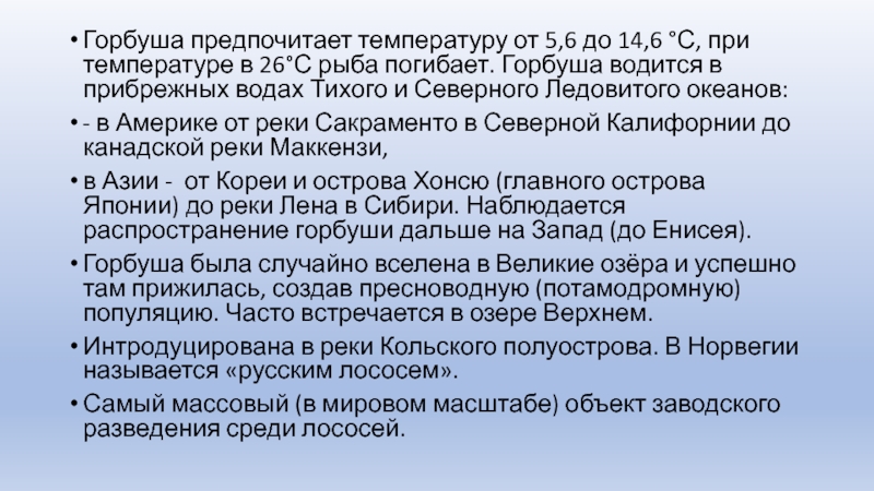 Слайд 10Горбуша предпочитает температуру от 5,6 до 14,6 °С, при температуре