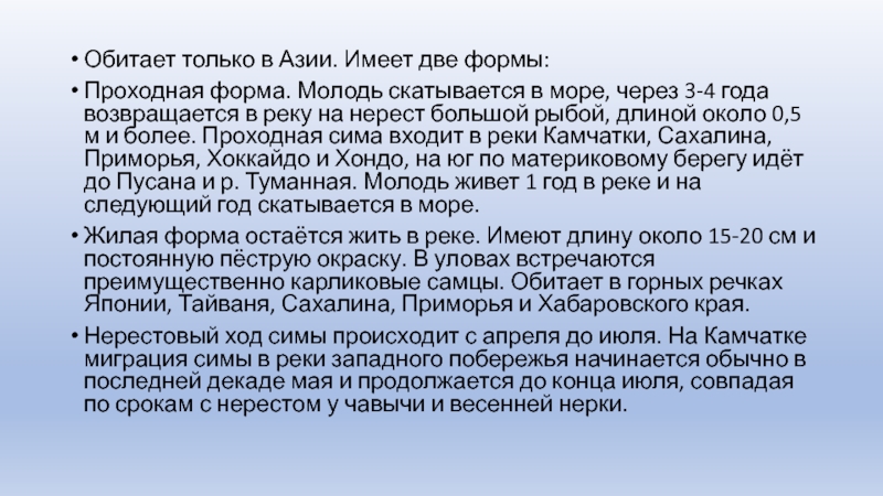 большой рыбой, длиной около 0,5 м и более. Проходная сима входит в реки Камчатки, Сахалина, Приморья, Хоккайдо и Хондо, на юг по материковому берегу идёт до Пусана и р. Туманная. Молодь живет 1 год в реке и на следующий год скатывается в море.