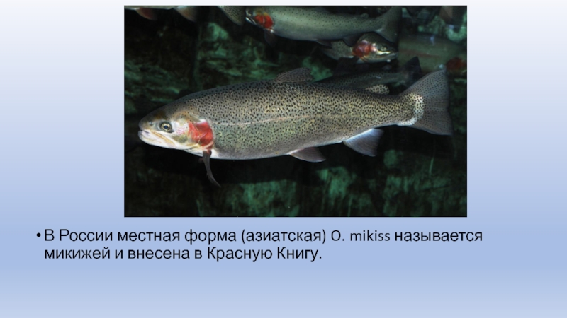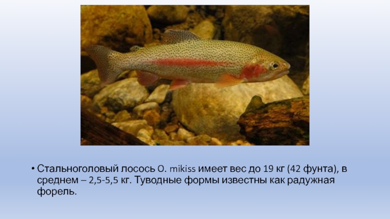 Слайд 25Стальноголовый лосось O. mikiss имеет вес до 19 кг (42