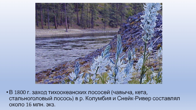 Слайд 3В 1800 г. заход тихоокеанских лососей (чавыча, кета, стальноголовый лосось)
