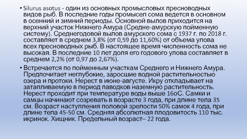 Слайд 86Silurus asotus - один из основных промысловых пресноводных видов рыб.