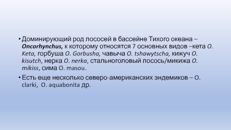 Слайд 5Доминирующий род лососей в бассейне Тихого океана – Oncorhynchus, к