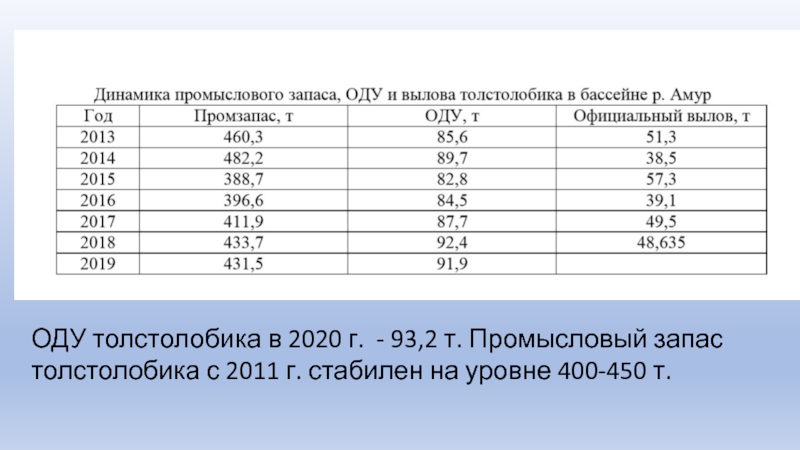 Слайд 71ОДУ толстолобика в 2020 г. - 93,2 т. Промысловый запас
