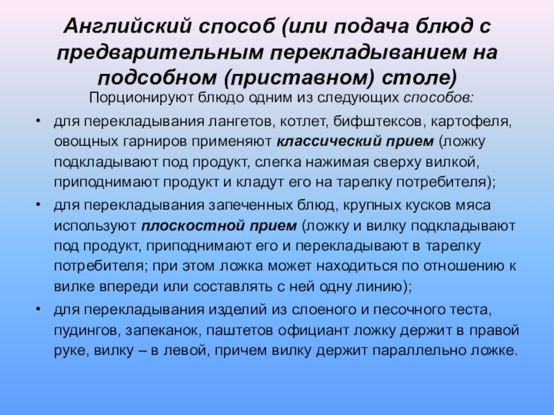 бифштексов, картофеля, овощных гарниров применяют классический прием (ложку подкладывают под продукт, слегка нажимая сверху вилкой, приподнимают продукт и кладут его на тарелку потребителя);