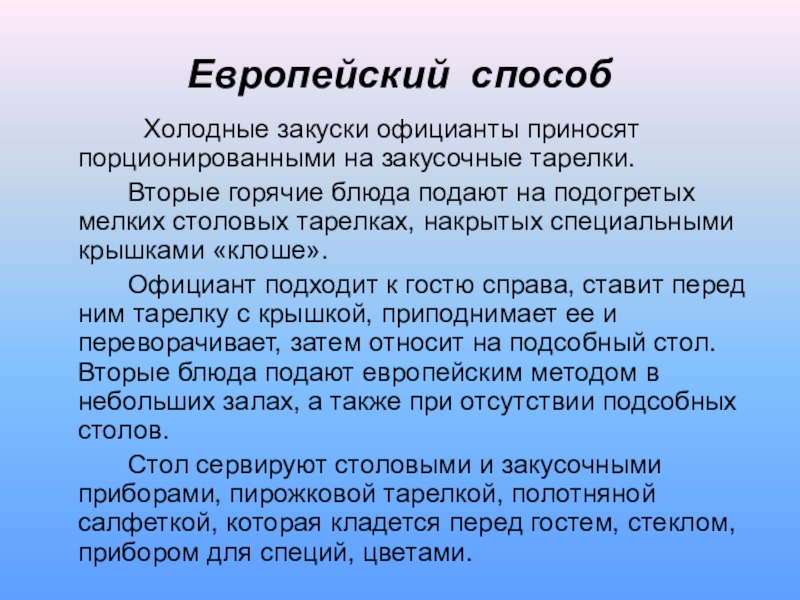Официант подходит к гостю справа, ставит перед ним тарелку с крышкой, приподнимает ее и переворачивает, затем относит на подсобный стол. Вторые блюда подают европейским методом в небольших залах, а также при отсутствии подсобных столов.