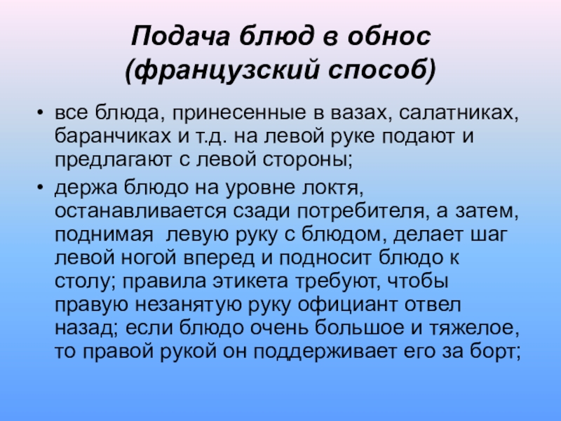 слегка наклоняет блюдо в сторону потребителя. Край блюда должен нависать над краем бортика тарелки. Не следует касаться блюдом стола или поднимать его высоко над столом;