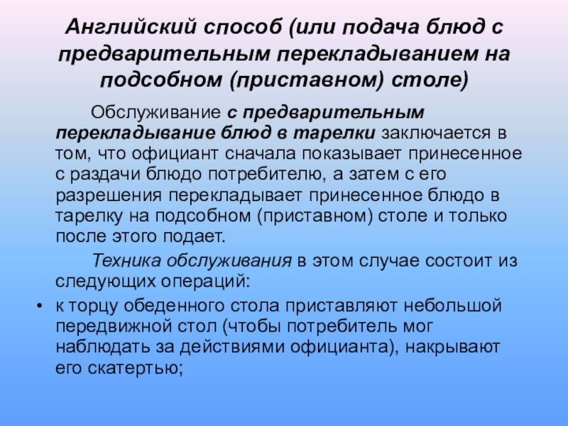 Слайд 7Английский способ (или подача блюд с предварительным перекладыванием на подсобном