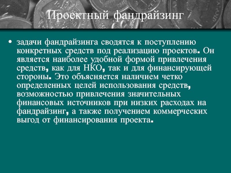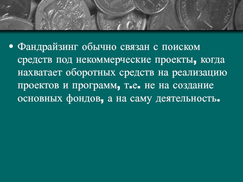 Слайд 10Фандрайзинг обычно связан с поиском средств под некоммерческие проекты, когда
