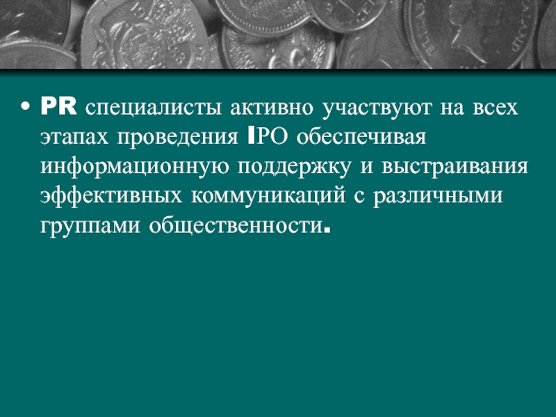 Слайд 8PR специалисты активно участвуют на всех этапах проведения IРО обеспечивая