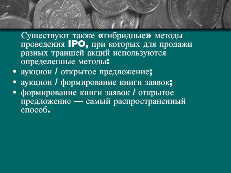 Слайд 2 Существуют также «гибридные» методы проведения IPO, при которых