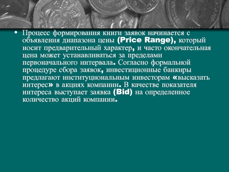 устанавливаться за пределами первоначального интервала. Согласно формальной процедуре сбора заявок, инвестиционные банкиры предлагают институциональным инвесторам «высказать интерес» в акциях компании. В качестве показателя интереса выступает заявка (Bid) на определенное количество акций компании.