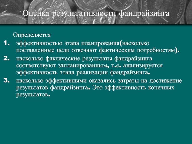 насколько эффективными оказались затраты на достижение результатов фандрайзинга. Это эффективность конечных результатов.