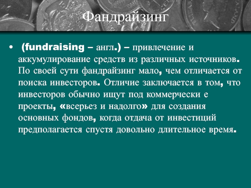 (fundraising – англ.) – привлечение и аккумулирование средств из