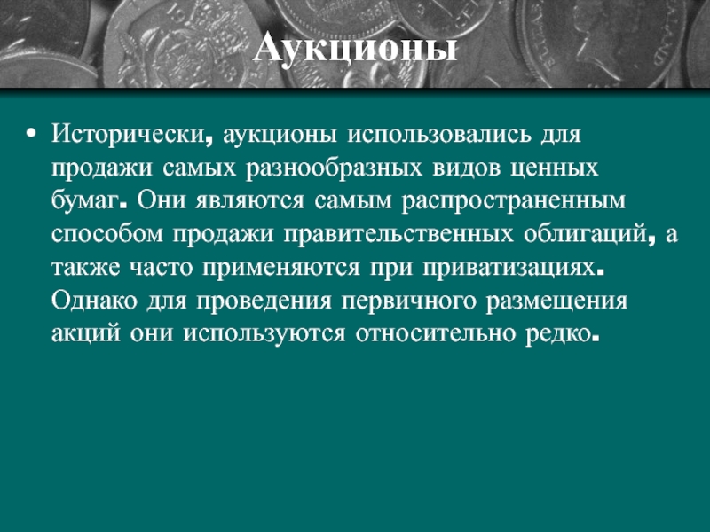 Исторически, аукционы использовались для продажи самых разнообразных видов ценных бумаг.