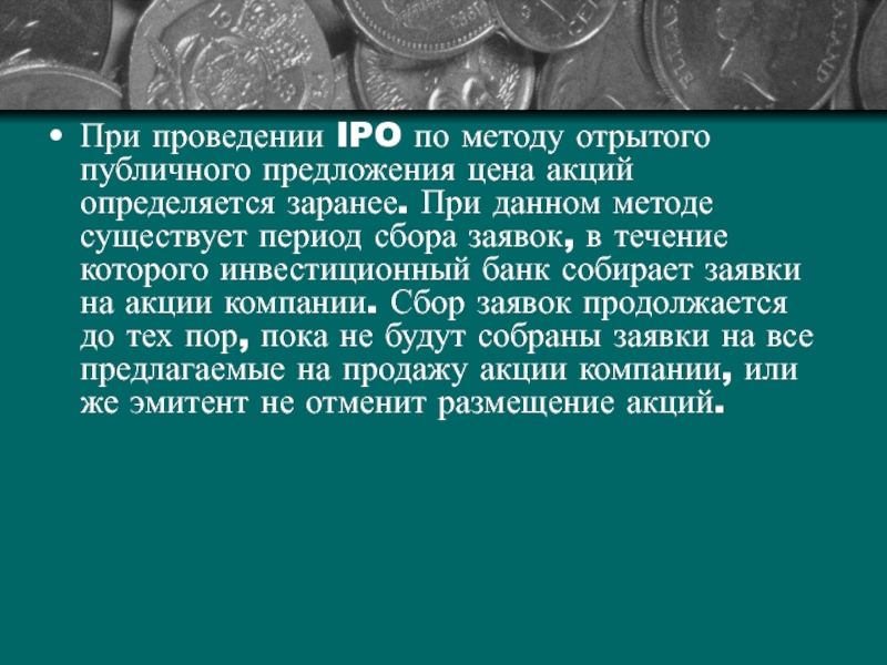 Слайд 3При проведении IPO по методу отрытого публичного предложения цена акций