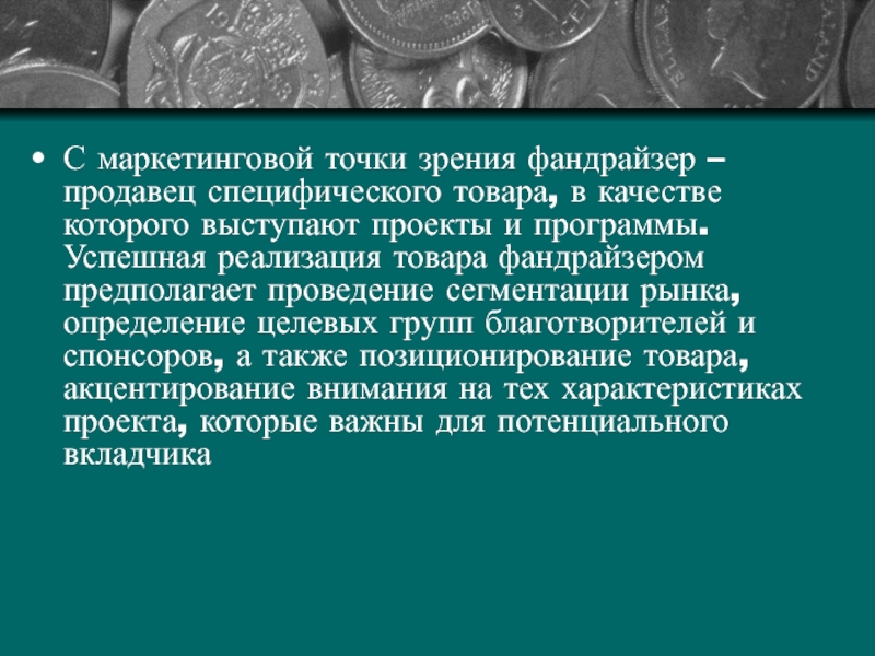 Слайд 17С маркетинговой точки зрения фандрайзер – продавец специфического товара, в