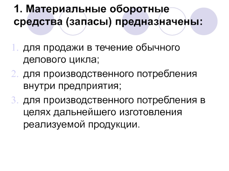 Слайд 161. Материальные оборотные средства (запасы) предназначены: