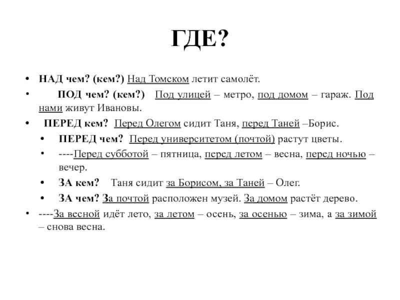 ЗА: за домом; за книгой; за обедом; кто за мной? За неимением времени + следить, наблюдать, бежать, следовать, гнаться за;