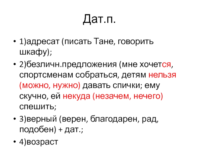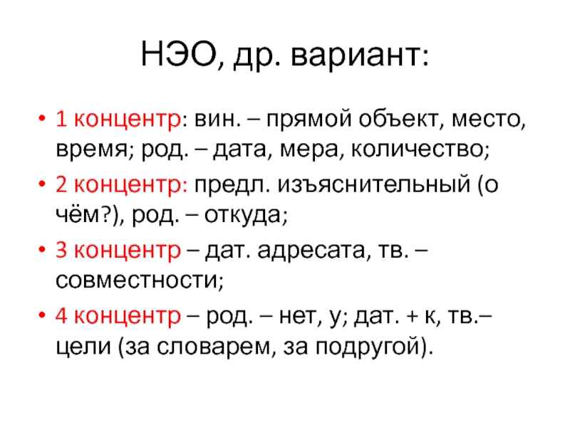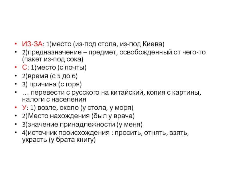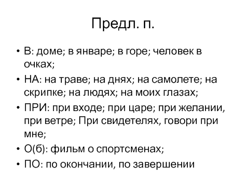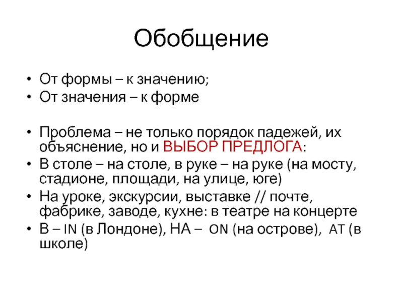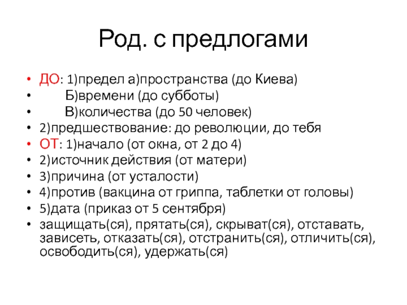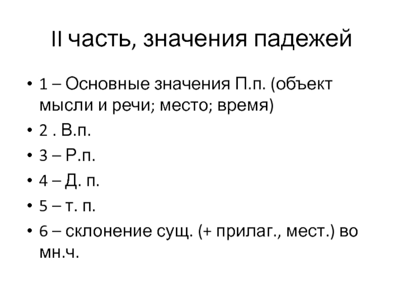 (время, место, признак в РЯ можно выразить…) или форме (Род. п. имеет значения, употребляется с предлогами…).