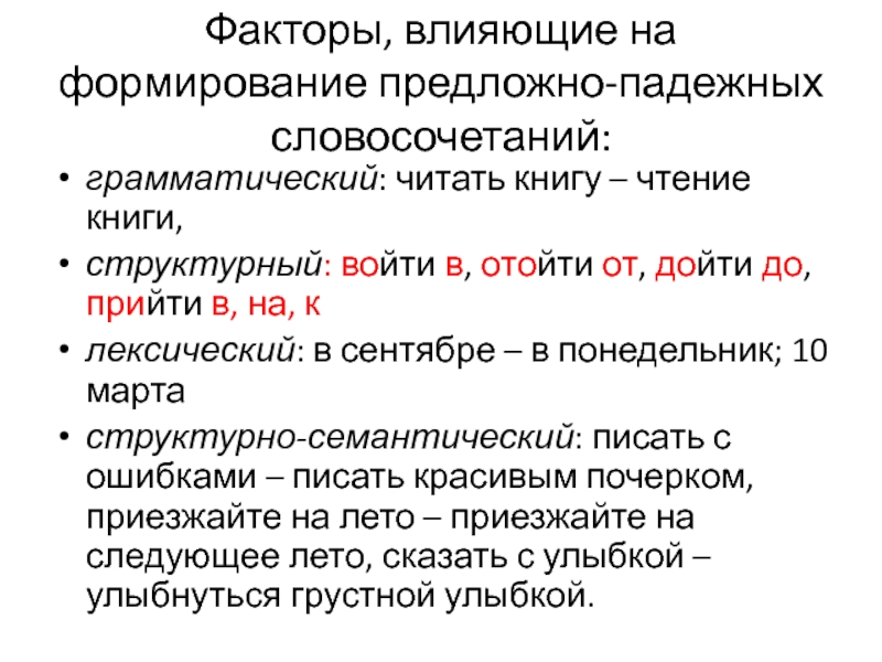 Слайд 4Факторы, влияющие на формирование предложно-падежных словосочетаний: