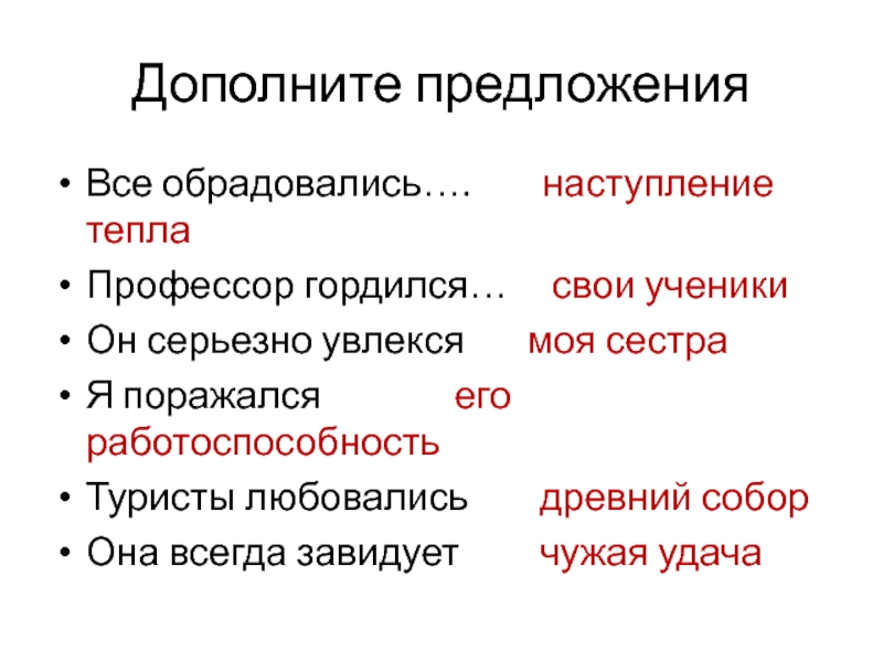 1. Всех восхищает терпение Ольги в обращении с детьми. 2. Ирину интересует история Италии 18 в. 3.Людмилу возмутило грубое поведение Игоря. 4. Артёма увлекла игра, и он забыл об обеде.
