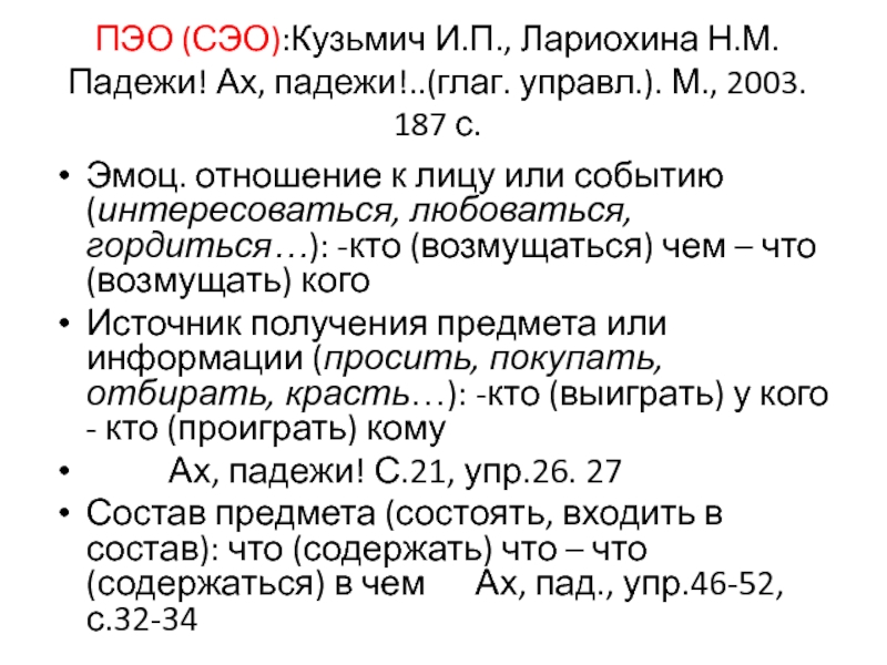 Слайд 38ПЭО (СЭО):Кузьмич И.П., Лариохина Н.М. Падежи! Ах, падежи!..(глаг. управл.). М.,