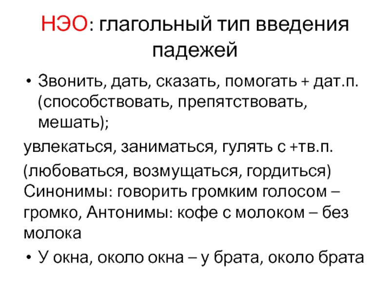 Синонимы: говорить громким голосом – громко, Антонимы: кофе с молоком – без молока
