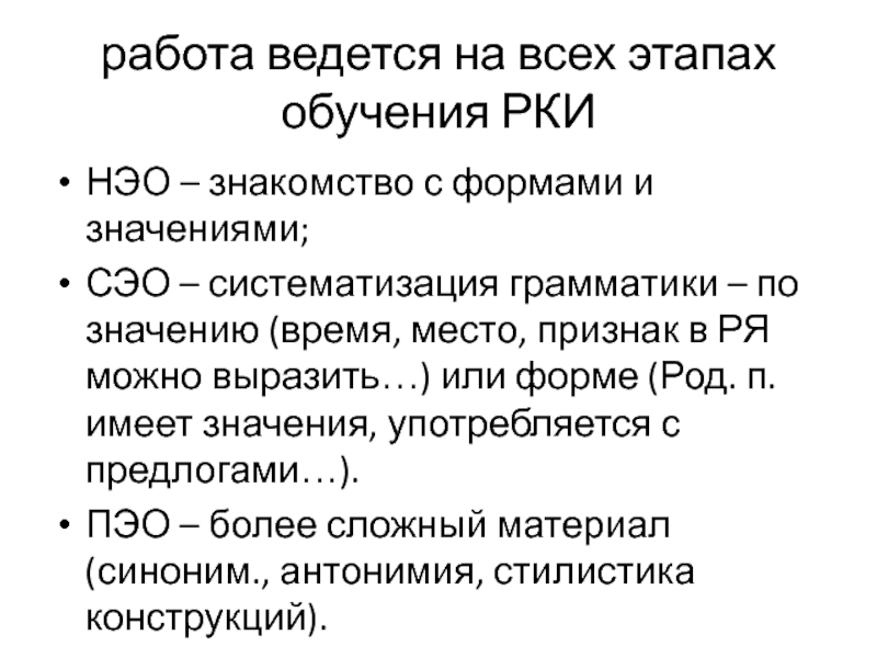 Слайд 5работа ведется на всех этапах обучения РКИ