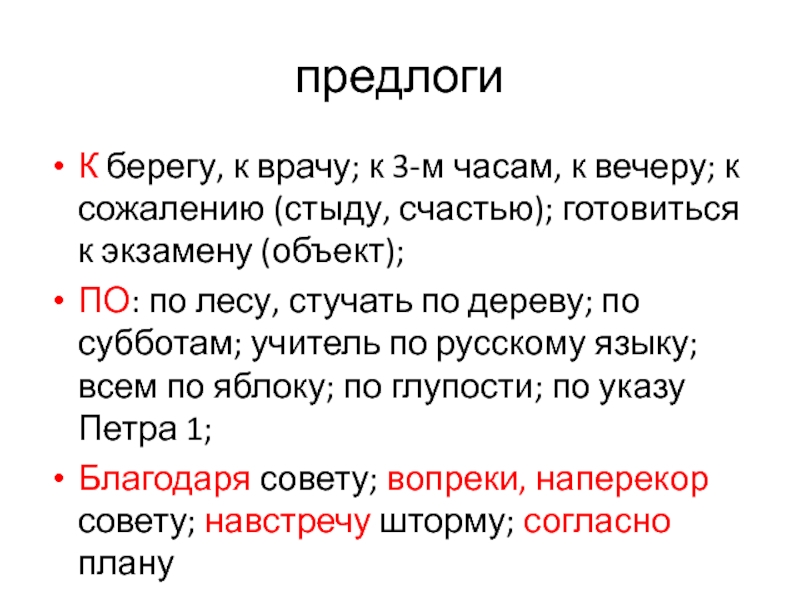 по дереву; по субботам; учитель по русскому языку; всем по яблоку; по глупости; по указу Петра 1;