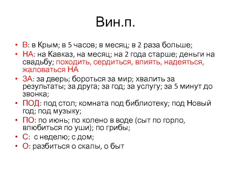 1 падеж употребляется с разными предлогами (в школу, за неделю, на месяц);