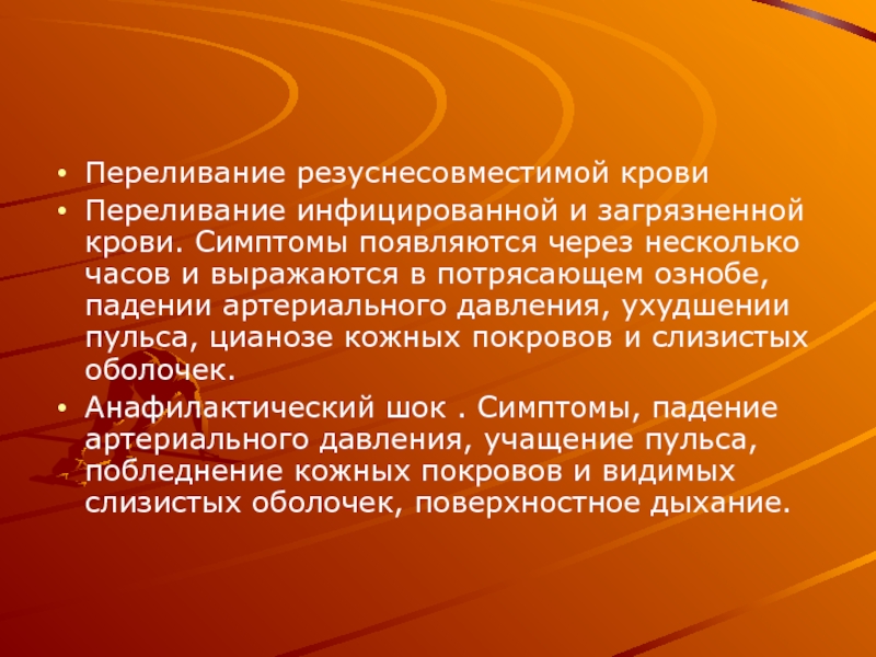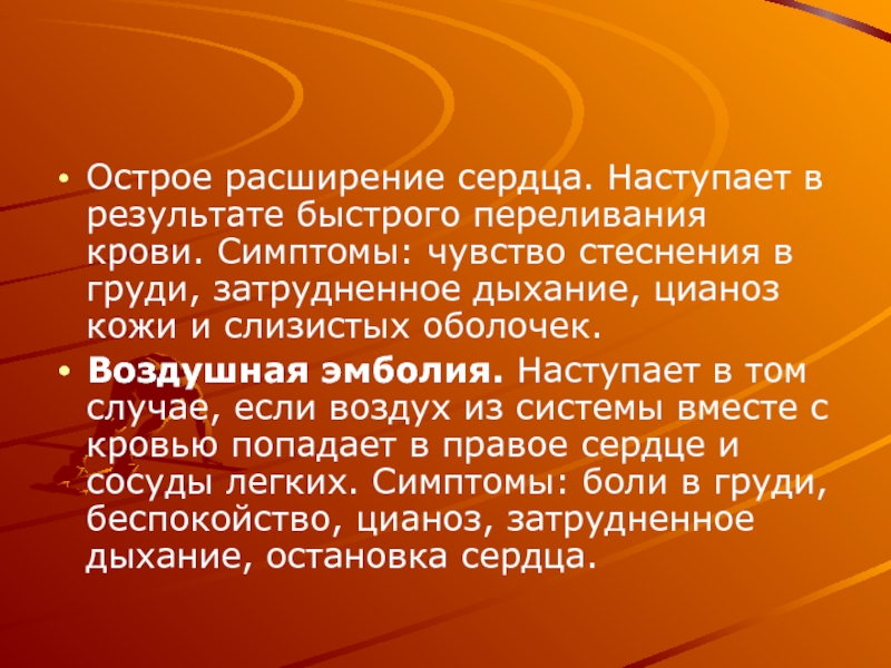 Слайд 31Острое расширение сердца. Наступает в результате быстрого переливания крови. Симптомы:
