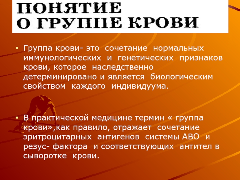 Слайд 10Группа крови- это сочетание нормальных иммунологических и генетических признаков крови,