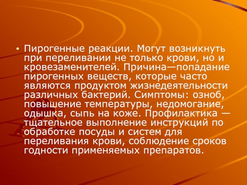 Слайд 30Пирогенные реакции. Могут возникнуть при переливании не только крови, но