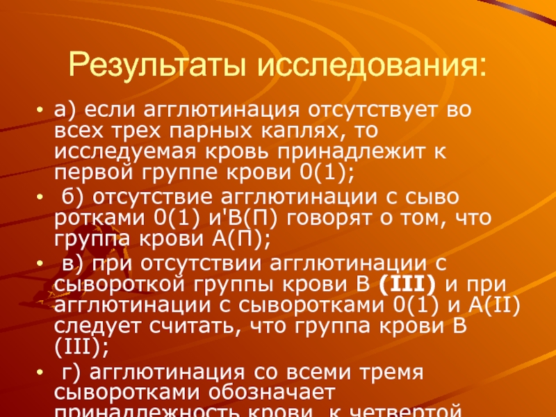 Результаты исследования :если наступает агглютинация, кровь несовместима и переливание недопустимо, если агглютинации не происходит, кровь донора и реципиента совместима и переливание возможно.