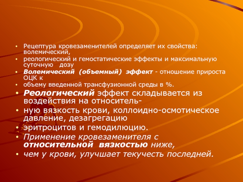 Слайд 34Рецептура кровезаменителей определяет их свойства: волемический,