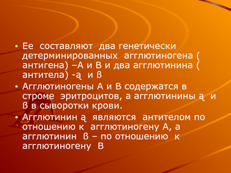 Слайд 8Ее составляют два генетически детерминированных агглютиногена ( антигена) –А и