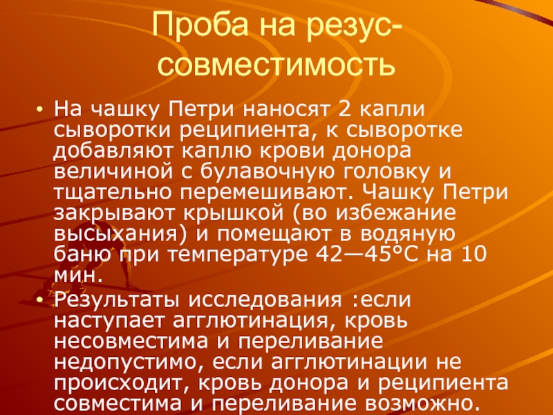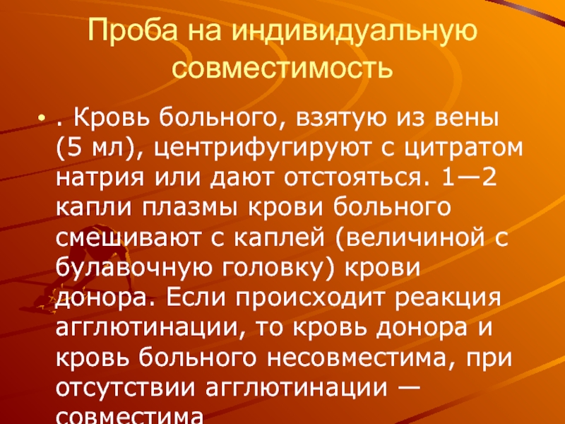 плазмы крови больного смешивают с каплей (величиной с булавочную головку) крови донора. Если происходит реакция агглютинации, то кровь донора и кровь больного несовместима, при отсутствии агглютинации — совместима