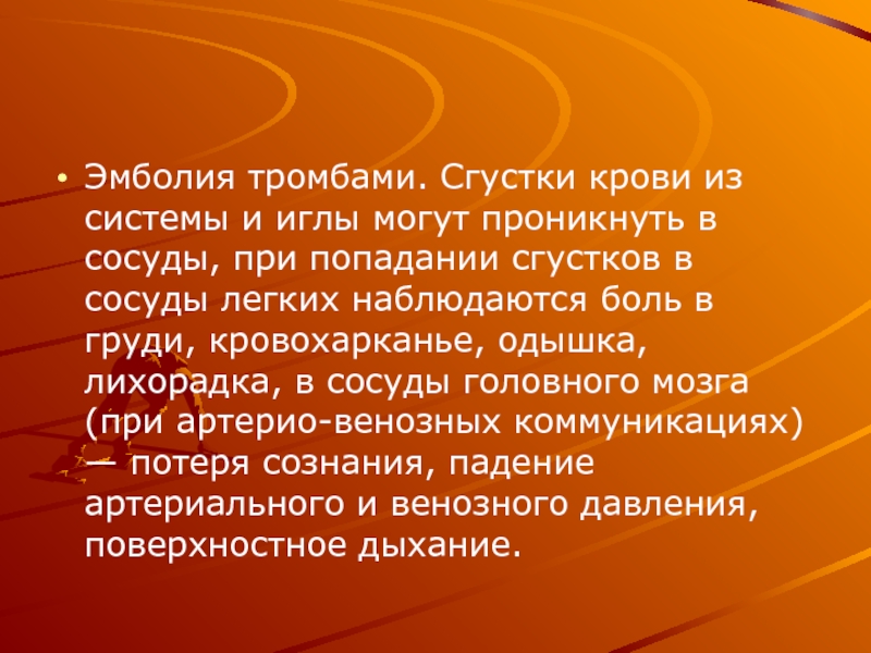 Слайд 32Эмболия тромбами. Сгустки крови из системы и иглы могут проникнуть