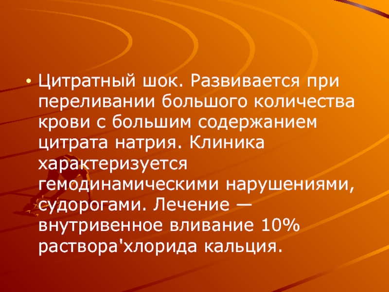 Слайд 29Цитратный шок. Развивается при переливании большого количества крови с большим