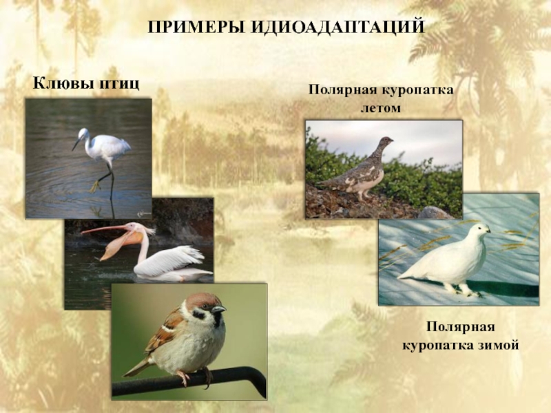 ПРИМЕРЫ ИДИОАДАПТАЦИЙКлювы птицПолярная куропатка летомПолярная куропатка зимой