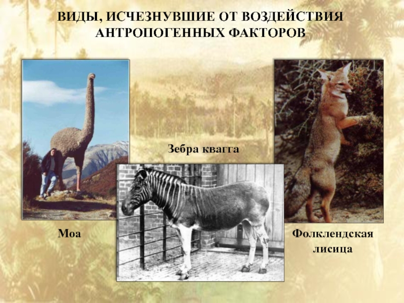 ВИДЫ, ИСЧЕЗНУВШИЕ ОТ ВОЗДЕЙСТВИЯ АНТРОПОГЕННЫХ ФАКТОРОВЗебра кваггаМоаФолклендская лисица